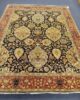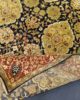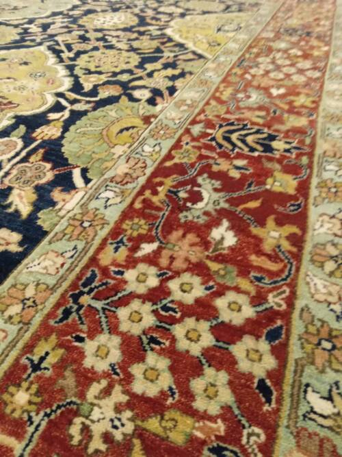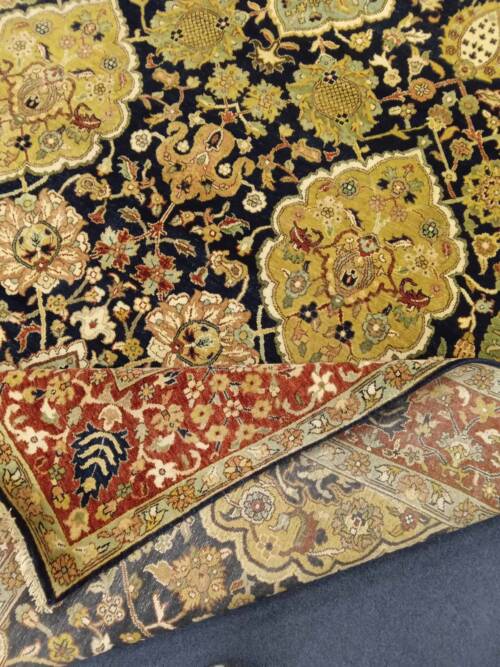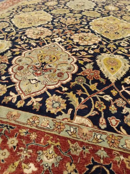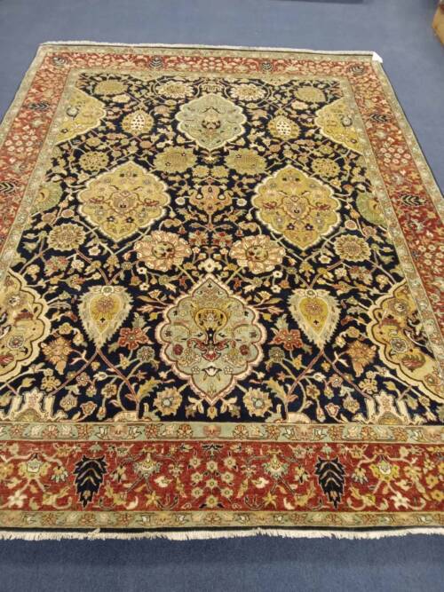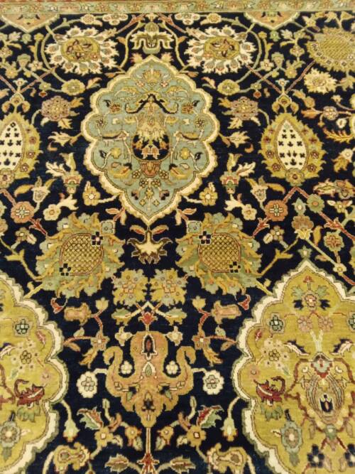 Beautifully handwoven Bhadohi rug. A dark blue background with stunning golds and greens used as secondary colours.