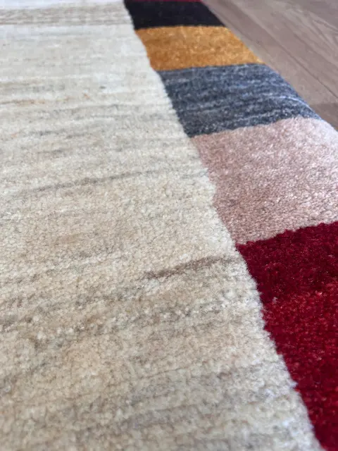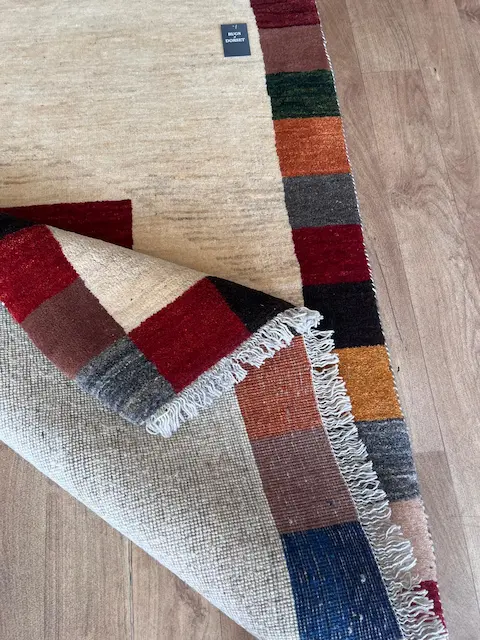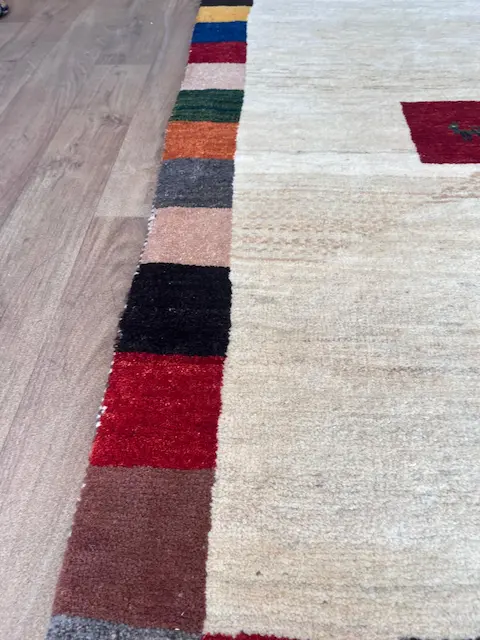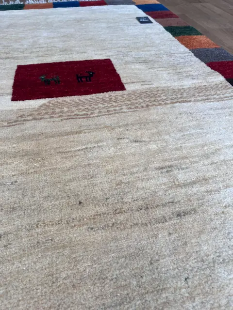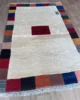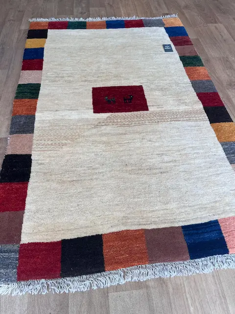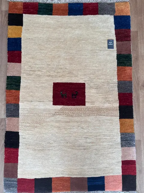 The Luri and Qashqa’i nomads who migrate over vast territories in Southern and Western Iran have long been famous for their carpets, made from the wool of their own sheep which they have carded and spun themselves. They are woven by the women of the tribes, on primitive portable looms which are stretched out on the ground. Apart from the fine more formal carpets for which the tribes are famous, they also weave another type of rug which are much more creative in design. These are the Gabbehs. This particular piece mixes the checker board design with a plain open field using undyed wool. Giving a totally unique rug